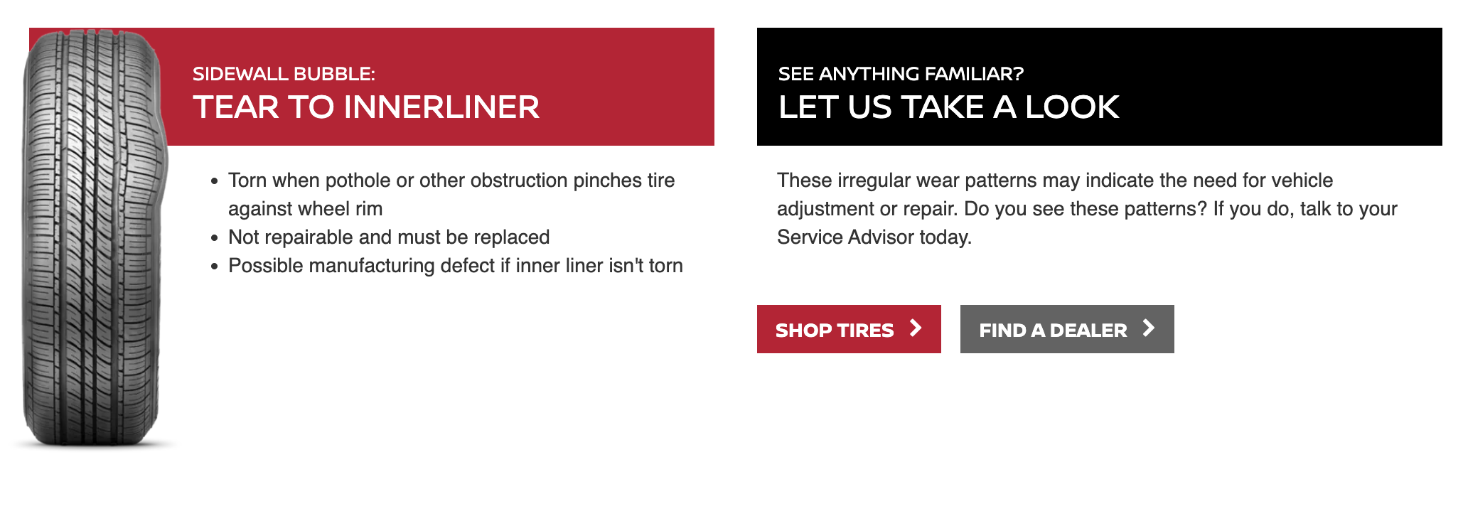 New tires are an investment, and with our road hazard coverage, if you get a flat, in most instances, we’ll be able to repair or replace it. Eligible tires only. Restrictions apply. See Road Hazard Consumer Brochure for complete details regarding 24-month Road Hazard Coverage.