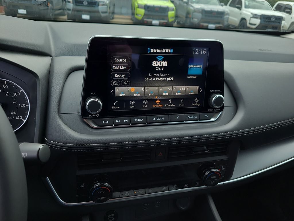 - Radio: AM/FM NissanConnect -inc: 6 speakers plus 2 tweeters, Apple CarPlay, Android Auto, 8" color touch screen display, Bluetooth®, 2 front USB type-C, Wi-Fi hotspot and NissanConnect Services powered by SiriusXM